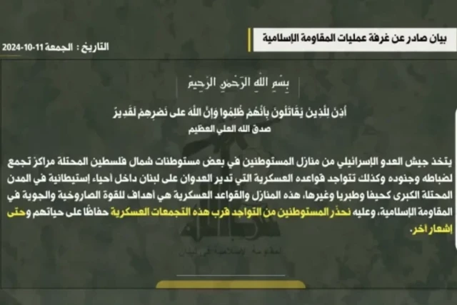 “These homes and military bases are targets for the missile and air force of the Islamic Resistance. Accordingly, we warn the settlers against being present near these military gatherings in order to protect their lives until further notice.”