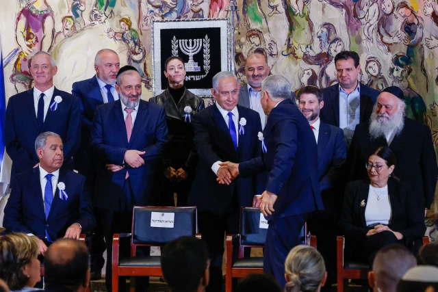 With a decisive right-wing coalition taking shape, the 120 members of the 25th Knesset were sworn in today, two weeks after the Nov. 1 election, with an admonition to keep "minorities – who are fearful that their needs will not be on the agenda – in mind.