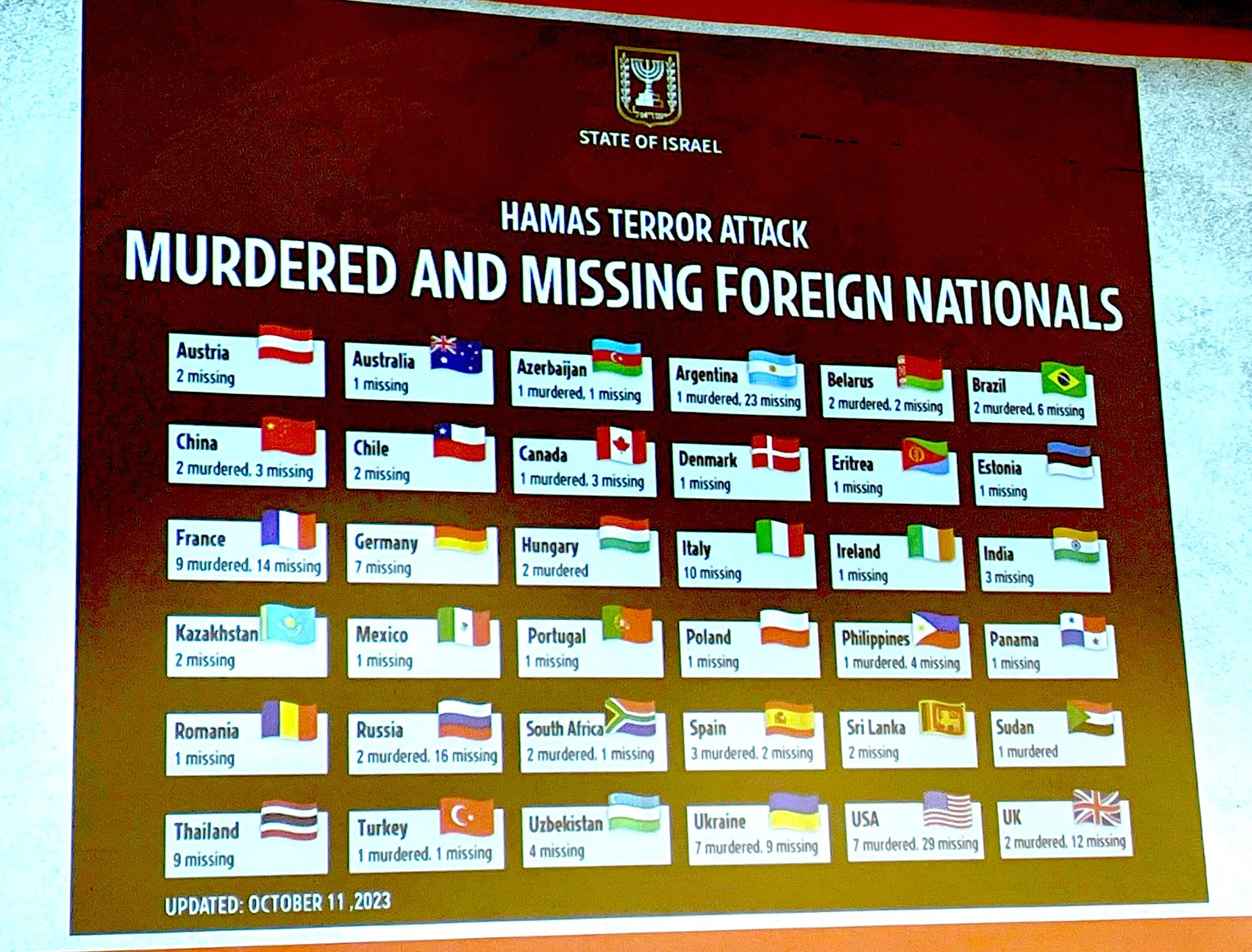 The briefing comes as Israel confirmed that more than 1,300 Israeli civilians have been killed by Hamas, and more than 3,000 have been wounded.