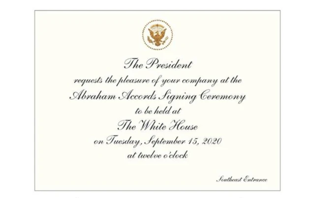 White House invitation to Abraham Accords signing ceremony to be held Sept. 15, 2020.