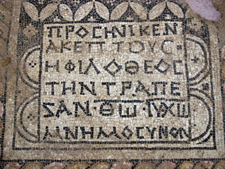 One part of the mosaic that will be of great interest is the inscription dedicating a table, most likely a Eucharist table, by a woman named Akeptous.