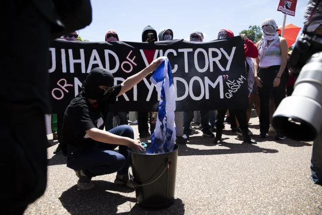 Several protesters, with their faces covered by keffiyehs, held a banner that read “JIHAD OF VICTORY OR MARTYRDOM.” They were seen carrying the banner while walking toward the White House and chanted: “Al-Qassam, make us proud! Kill another soldier now! Hezbollah, Hezbollah! Kill another Zionist now!”