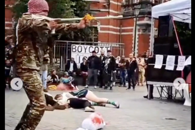 Video clips from the event showed masked men wearing keffiyehs and military fatigues, pointing prop guns while other “actors” lay on the ground, simulating dead bodies. Fake blood is visible in the footage. After reenacting the Oct. 7 massacre, the individuals dressed as Hamas terrorists and raised their arms in a display of “victory.”