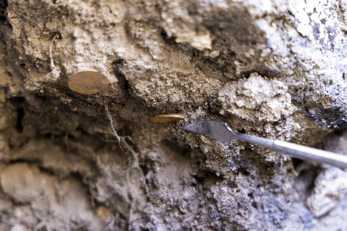 During the excavations in July, Edie Lipsman, a metal detector operator working at the excavation, recorded a signal near a large stone. Further investigation revealed a cache of coins.