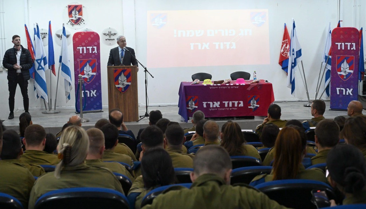 Israeli Prime Minister Benjamin Netanyahu attended a reading of the Book of Esther on Sunday with commanders and soldiers from the Military Police Erez Battalion.
