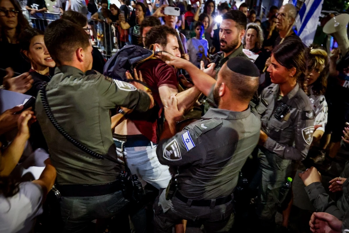 In videos on social media, shared by Israel's Channel N12, police were seen arresting one protester and tying him to a vehicle. In a separate video, a police officer can be heard telling a protester he would “rape his mother.”