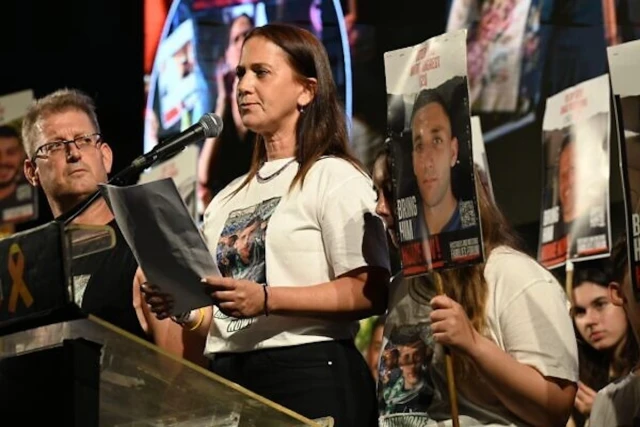 Michal Lobanov, wife of the murdered hostage Alex Lobanov, also spoke at the rally. She told those gathered: "My heart was murdered in Gaza.”