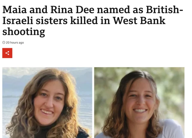 In its report about the British-Israeli sisters, Maia and Rina Dee, who were killed in a terror attack in the Jordan Valley on Friday, the BBC omitted any indication of a terror attack, citing “soaring Israeli-Palestinian tensions and violence.”