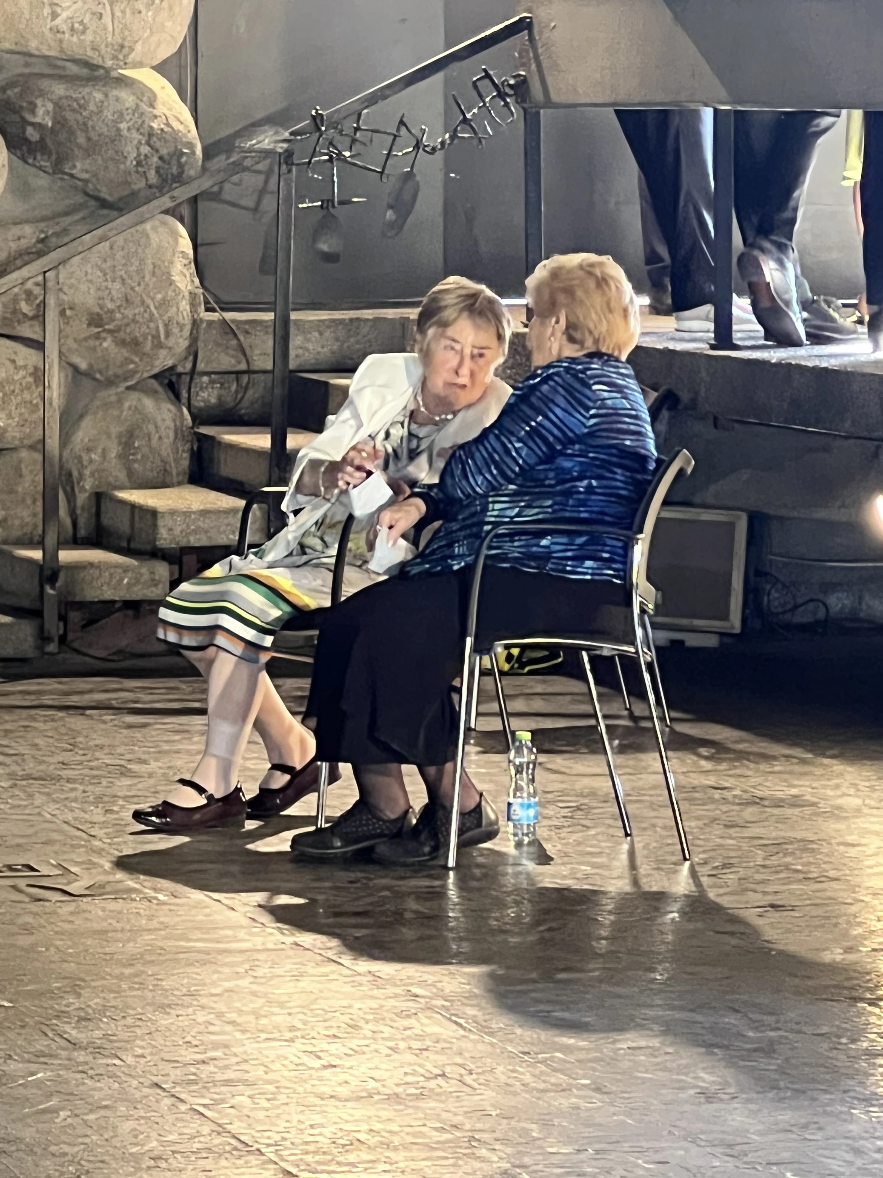 The highlight of the president’s visit to Yad Vashem, however, was his nearly 12-minute greeting with two Holocaust survivors – Rena Quint, 86, and Giselle (Gita) Cycowicz, 95. The president was meant only to shake their hands on his way out of the hall, but instead knelt down on one knee and embraced them, kissing Quint’s cheek with tears in his eyes.