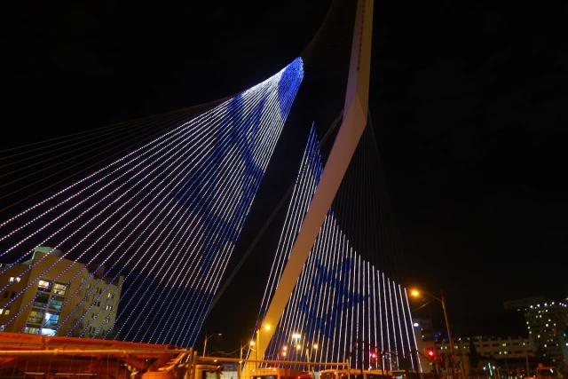 The Strings Bridge in entrance to Jerusalem, illuminated in the shape of the Israeli flag (Photo: Shutterstock)