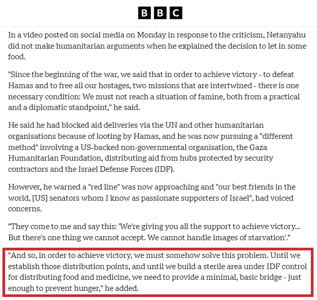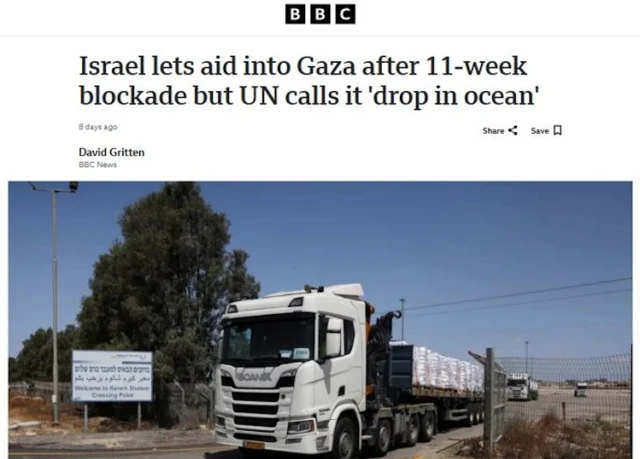 All versions of that report by David Gritten – which currently appears under the title “Israel lets aid into Gaza after 11-week blockade but UN calls it ‘drop in ocean’” – include the following highlighted section: