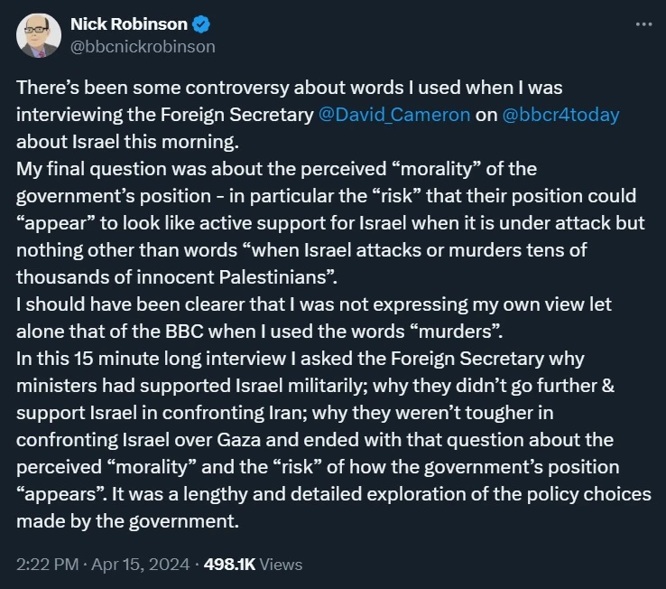 Nowhere in this fifteen-minute interview did listeners hear Robinson use qualifying phrases such as ‘some might say that…’ or ‘there are those who contend that…’. At no point did Robinson reference terrorism, Hamas or the October 7th atrocities. What listeners did hear from him, however, were context-free claims – for example regarding UNRWA and the status of the building next to the Iranian embassy in Damascus – and allegations.