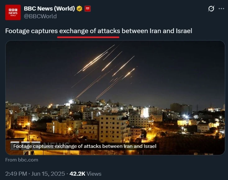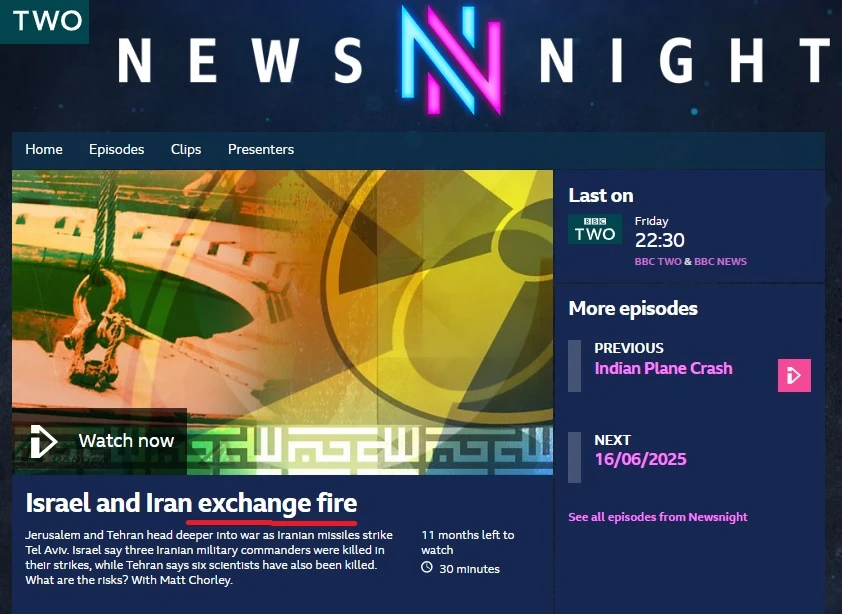 That is a crucial element to proper understanding of the story which the BBC has so far failed to adequately clarify to its audiences. Instead it allows itself to promote the notion of false equivalence between strikes on military targets and attacks on civilians by means of language such as “trading fire”, “exchange fire”, “exchange attacks” or “exchange of attacks between Iran and Israel”.