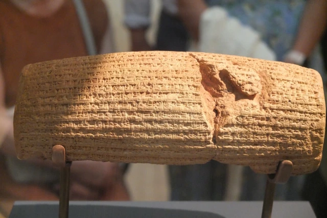Discovered in Babylon (modern-day Iraq) in 1879, the clay cylinder draws a straight line from ancient Persia to Jewish people and their history with inscriptions from King Cyrus. In part, Cyrus observes in the cuneiform text, “I took up my lordly abode in the royal palace amidst rejoicing and happiness. … My vast army marched into Babylon in peace; I did not permit anyone to frighten the people.”