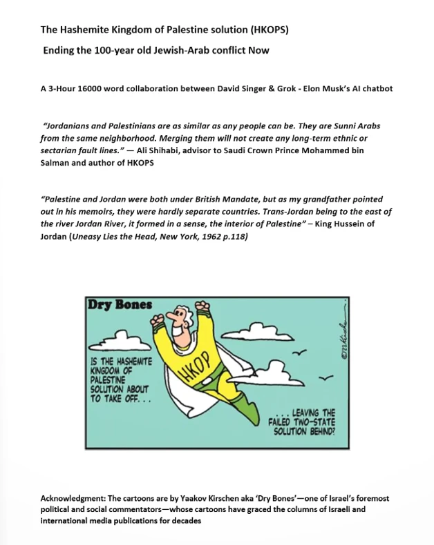 David Singer’s “The Hashemite Kingdom of Palestine Solution (HKOPS) Ending the 100 year-old Jewish-Arab conflict Now” flipbook is a visionary proposal. With xAI’s Grok, a three-hour, 16,000-word exchange between human and artificial intelligence resulted in the publication of this booklet. HKOPS calls for merging Jordan with 30% of Judea and Samaria (West Bank) under Hashemite rule, excluding Gaza post-October 7, 2023, and President Trump’s 2025 policy shift on 4 February 2025 treating Gaza as a separate territorial entity. Yaakov Kirschen’s cartoons enhance six pages, whilst Singer points to the 1950-1967 precedent when Jordan and Judea and Samaria (West Bank) were unified, and the 1994 Israel-Jordan peace accord which supports Jordan-Israel negotiations to implement HKOPS. A clickable Al Arabiya link on Page 2, showcasing the actual HKOPS solution published in Saudi Arabia’s government-controlled Al Arabiya News (June 8, 2022), adds depth. The United Nations, ignoring HKOPS since 2022, must abandon creating a new State between Israel and Jordan. This proposal urges dialogue. A unique human-AI collaboration—potentially a world first—it inspires diplomatic use of AI to assist in negotiations. A must-read!