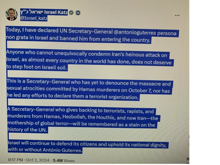 Foreign Minister Katz has banned Guterres from entering Israel: