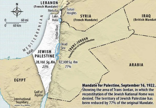 Israel’s borders derive from the 1922 British Mandate, which the League of Nations designated as the territory for a “Jewish national home.” The Mandate’s borders were: