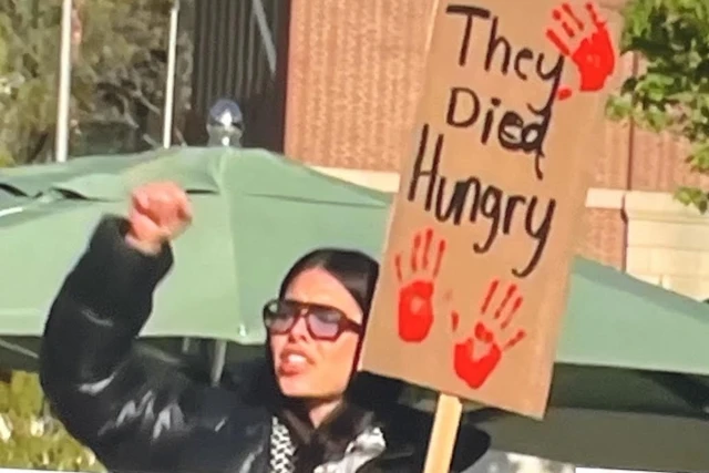 The poster, held up by a female Pro-Palestinian protester, showing bloody handprints next to the words, They Died Hungry, is a completely true statement. The only problem is that it was Israeli hostages who were starved to death and not the Gazans for whom she advocates.