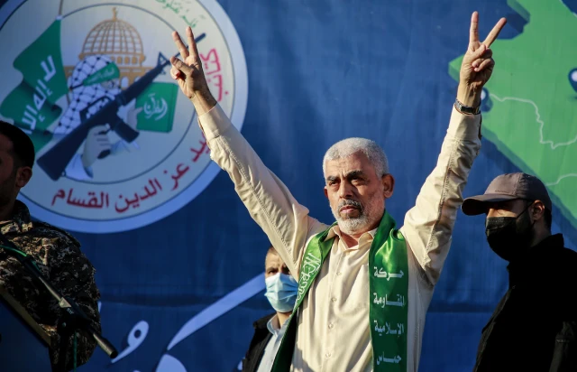 Yahya Sinwar, leader of the Palestinian Hamas movement, gestures on stage during a rally in Gaza City, on May 24, 2021. (Photo: Atia Mohammed/Flash90)