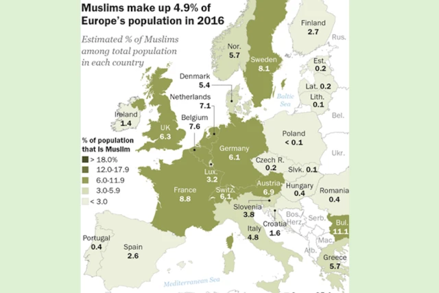 Within the 28 countries, defined by Pew, as having sizable Muslim populations, “even if all migration into Europe were to immediately and permanently stop – a “zero migration” scenario – the Muslim population of Europe still would be expected to rise from the current level of 4.9% to 7.4% by the year 2050…as they have one child more per woman, on average than other Europeans.”