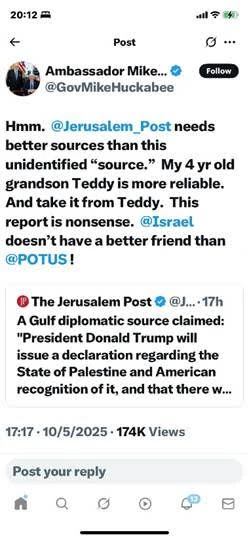 A Gulf diplomatic source, who declined to be named or disclose his position, told The Media Line, "President Donald Trump will issue a declaration regarding the State of Palestine and American recognition of it, and that there will be the establishment of a Palestinian state without the presence of Hamas."