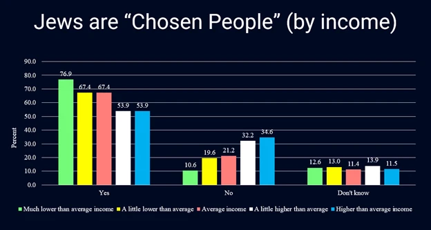 76.9% of Israeli Jews who said they earn “much lower than average income” also said they believe that Jews are God’s “chosen people.”