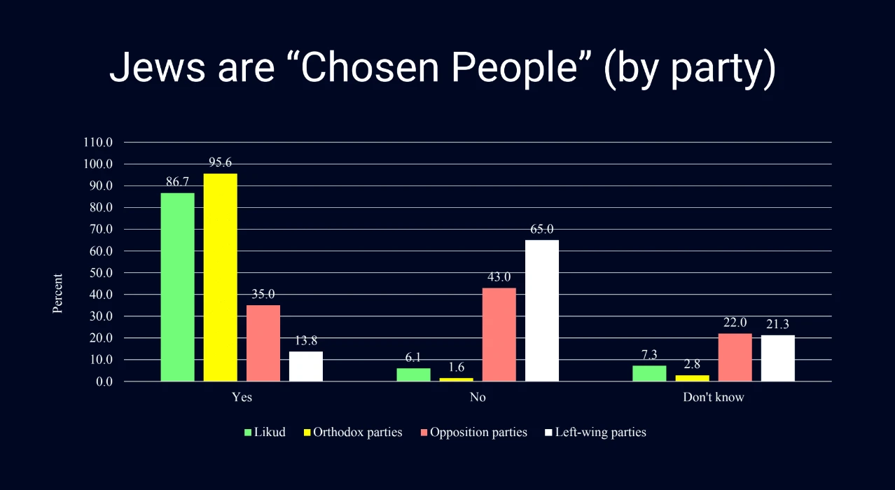 95.6% of Israelis who voted for Orthodox religious parties said they believe that Jews are the “chosen people” as described in the Bible