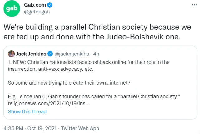 Torba and the Gab community are building a “parallel Christian society” because, according to one post, they are “fed up and done with the Judeo-Bolshevik one.”