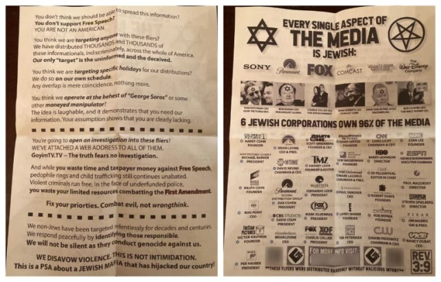 The offensive flyers were placed in plastic bags and set in front of private Jewish homes. They are rife with the classic anti-Semitic tropes that claim Jewish domination of politics and the media.