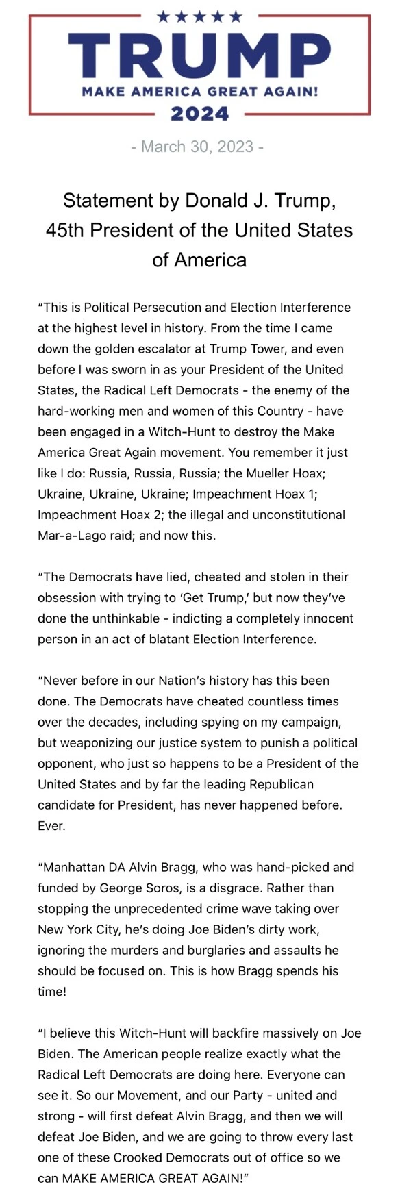 "This is Political Persecution and Election Interference at the highest level in history. From the time I came down the golden escalator at Trump Tower, and even before I was sworn in as your President of the United States, the Radical Left Democrats - the enemy of the hard-working men and women of this Country - have been engaged in a Witch-Hunt to destroy the Make America Great Again movement. You remember it just like I do: Russia, Russia, Russia; the Mueller Hoax; Ukraine, Ukraine, Ukraine; Impeachment Hoax 1; Impeachment Hoax 2; the illegal and unconstitutional Mar-a-Lago raid; and now this.