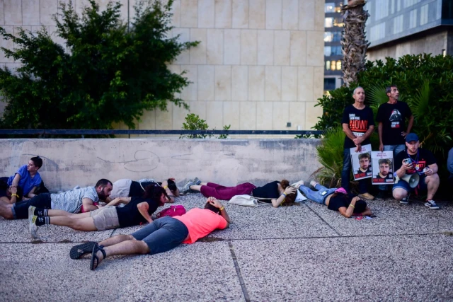 Families of Israelis held hostage by Hamas terrorists and others take cover as a siren alert is sounded at the "Hostage Square," outside the Tel Aviv Art Museum, Oct. 26, 2023. (Photo: Tomer Neuberg/Flash90)