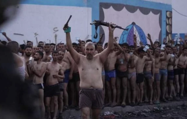 In one video, a man, clad only in underwear, is seen carrying an AK-47 rifle above his head, with the ammunition clip removed, and laying it down in a pile of weapons next to an Israeli tank.