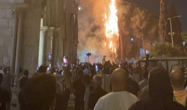 In Jerusalem, a fire was burning on the Temple Mount, known to Muslims as Haram al-Sharif. The fire was caused by firecrackers set off by Palestinians at the plaza.