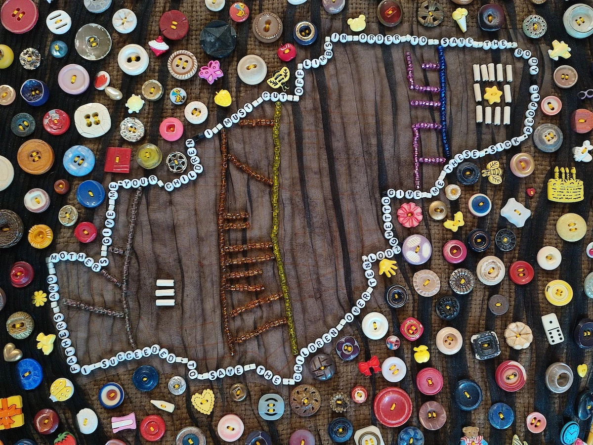 Roggel used buttons and buttonholes, showing all the camp barracks as buttonholes. “A buttonhole,” she explained, “even if you fix it, you can always see there was a buttonhole there, like a hurt… She fixed her life, but it was there all the time. It was [in the back of her mind]. When she was busy, she didn't really think about it, but when she was quiet and when the kids left the house, then it came back… but I always thank her for raising children like the way she raised them.”