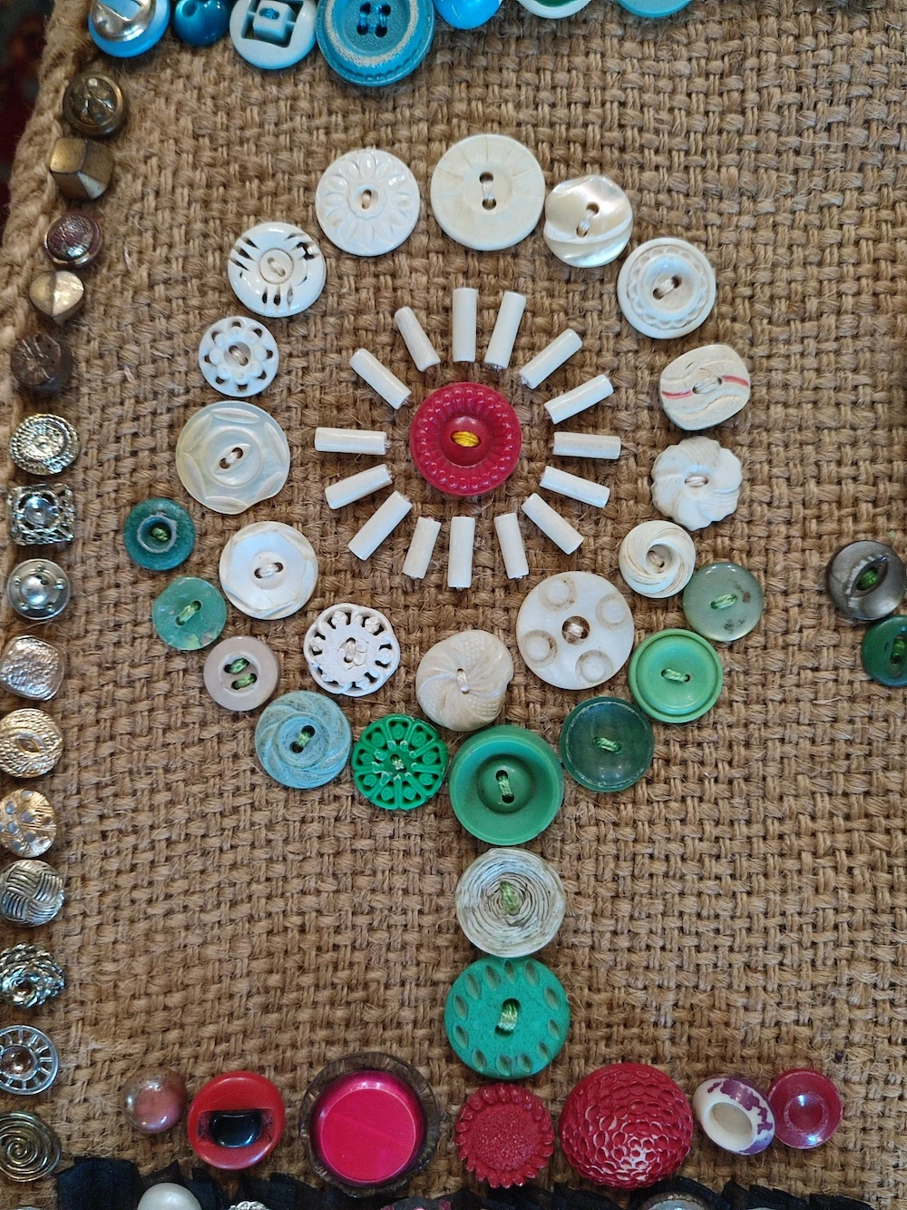 “Kids, ten years old, could [stay] alive because they could sew buttons,” Roggel explained. “Okay, buttons saved them. So here it is,” she said, pointing at the creation. “You see four flowers, right? And then, if you [follow the design], it's like the children, like a child drawing a child, you see the legs and the hands.”