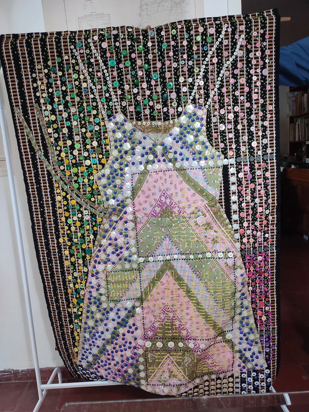 To honor the memory of this amazing woman, Roggel took something very personal, her mother-in-law’s own dress. With it, she made an embroidered quilt about motherhood.