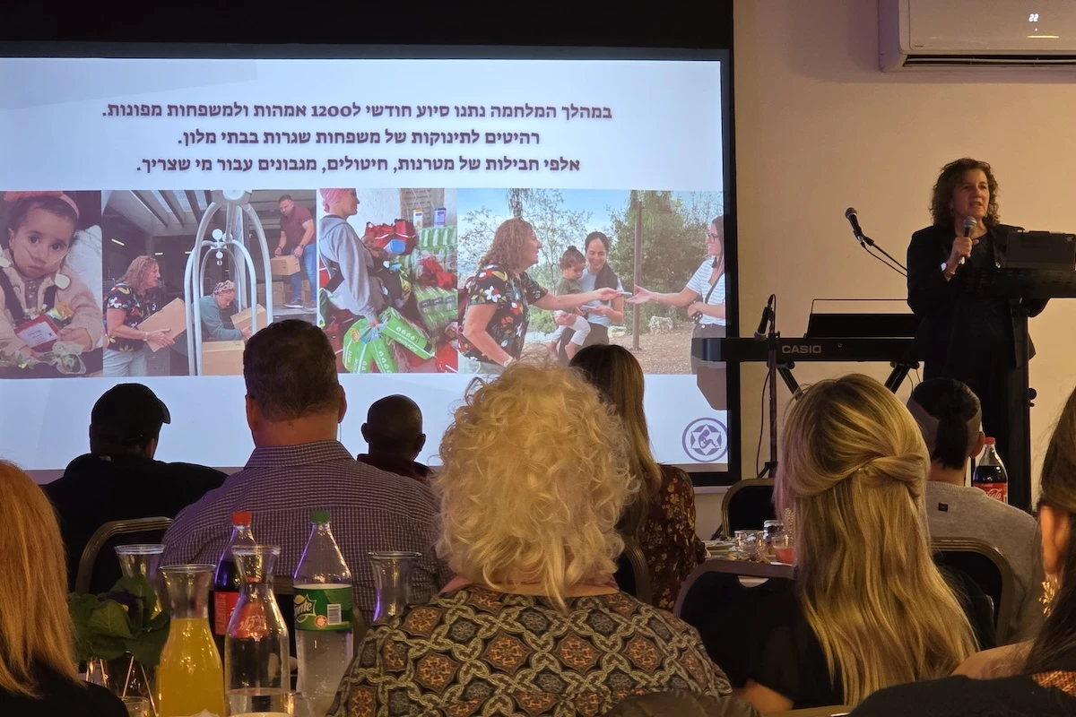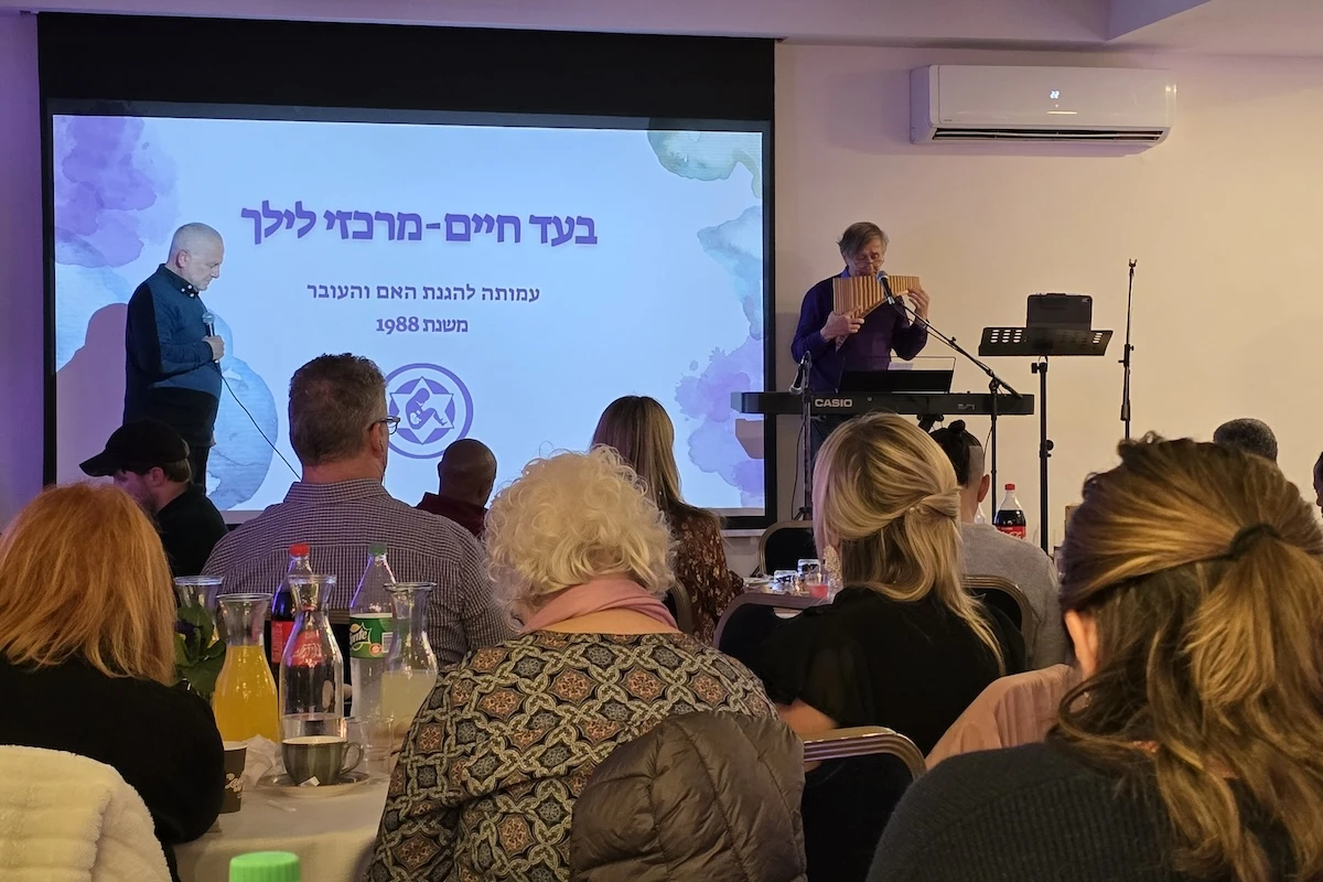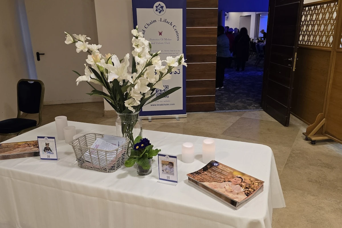 Each table featured a photo of a baby, along with their name, date of birth, and a QR code linking to the story of how their life was saved. The event hall buzzed with excitement as employees set up the buffet. Avi Mizrachi, director of the Dugit Outreach Center in Tel Aviv and pastor of Adonai Roi Congregation, welcomed the attendees and led a prayer for the meal. The evening continued with time for eating and fellowship around the tables.
