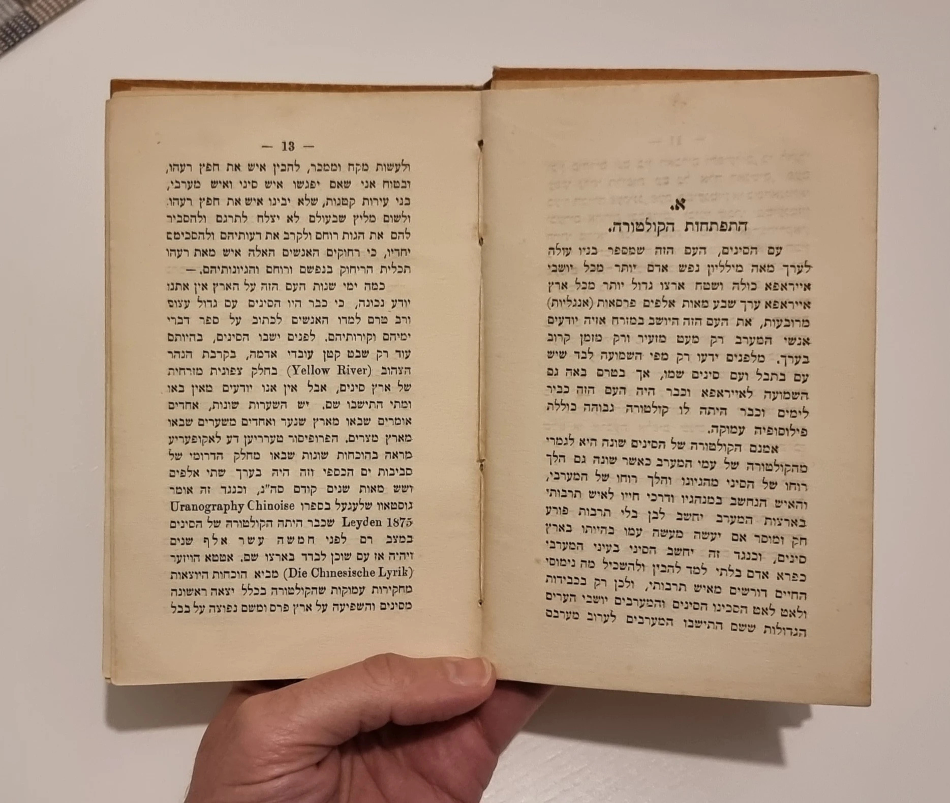 This other example is from 1911, when my great-great-grandfather, Saweli Perlmann wrote a book in Hebrew about China. From just this page here, we can see a number of differences from Modern Hebrew. Besides using the borrowed word “kultura” for culture (instead of the Hebrew “tarbut” that we use nowadays), he felt the need to add “Yellow River” in English in parentheses to make it clear what he meant, even though it seems pretty clear to me. He literally just translated the name “Yellow River” into Hebrew, but apparently he felt it was unclear. Also, it is clear that when referring to names of people and countries, he is using the Yiddish and not the Hebrew spelling. Asia with a Z and not an S, names of people using the Yiddish letter for E that is not used in that way in Hebrew, etc. This is typical of the pre-Ben-Yehuda type of published Hebrew.
