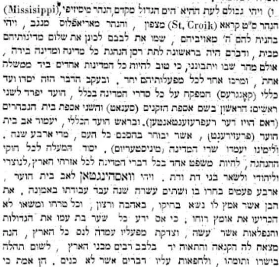 Here are two examples of what this looked like. This first one is from the “haCarmel” paper from 1861 and describes the American election system. Note how names of places like Mississippi are explained in Latin letters, while words like “congress” and “senate” or “president” first have a made-up Hebrew term for it (none of these specific ones survived), and then the original word is written in Yiddish.