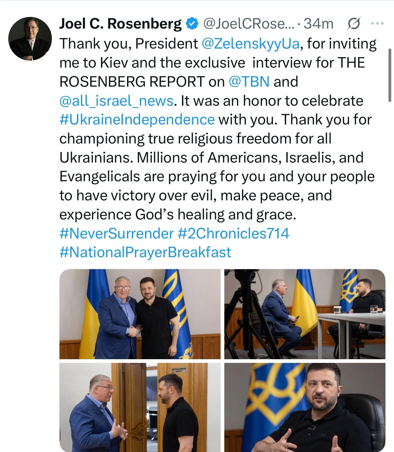 I thanked him for inviting me for this exclusive interview and apologized that I wasn’t able to make it to Ukraine’s annual National Prayer Breakfast, which he hosted on Monday, the largest one in Ukraine’s history.
