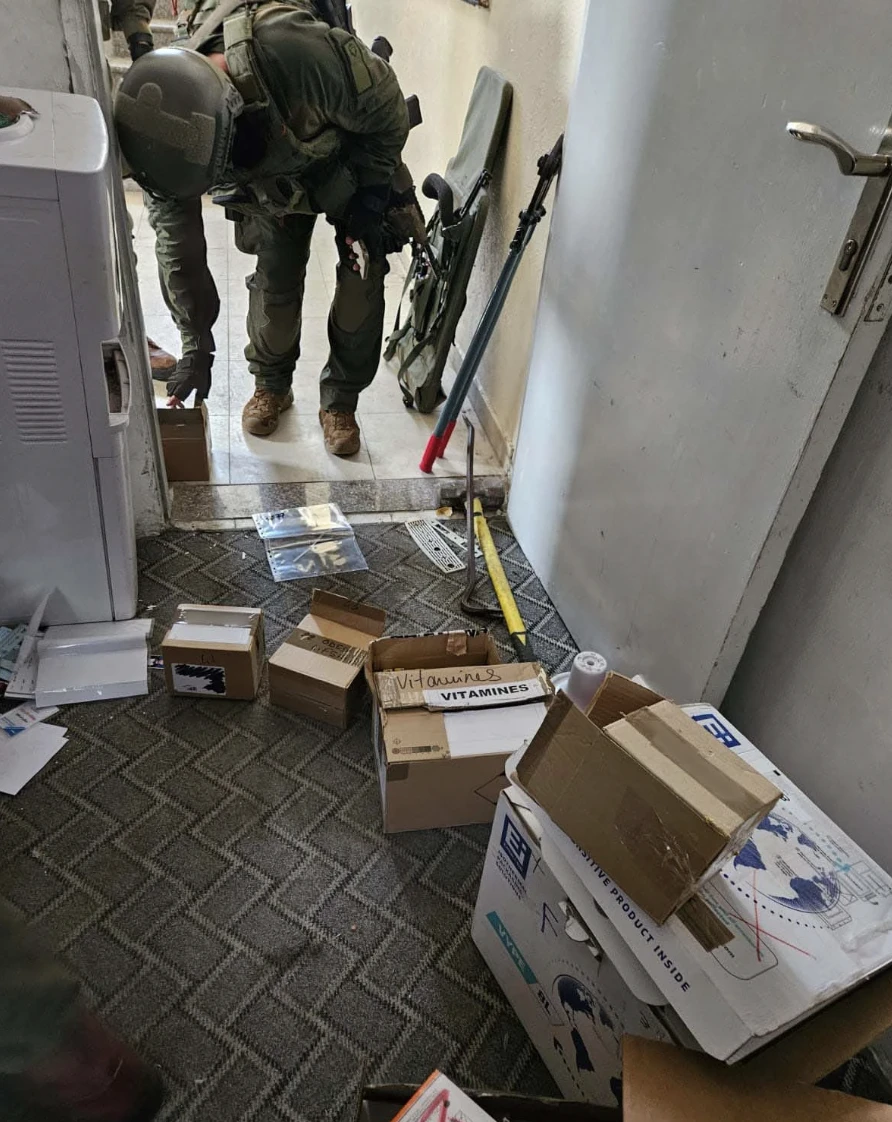 The commander of the Egoz unit, Lt.-Col. M. said that upon arriving at the Nasser hospital compound, “We found enemies, as well as ammunition and medicine for the hostages here – which did not reach them, and remained here completely packed.”