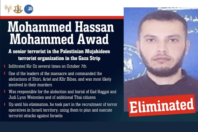 The IDF said that Awad was “a senior military commander in the Palestinian Mujahideen terrorist organization who infiltrated Nir Oz, oversaw the abductions of Shiri, Kfir, and Ariel Bibas and was most likely involved in their murders.”