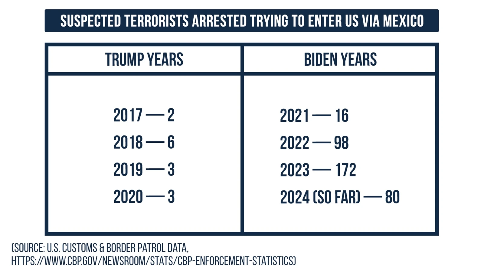 Under former President Donald J. Trump’s four years in office, for example, only 14 suspected foreign terrorists were arrested on the U.S.-Mexico border, according to U.S. Customs & Border Patrol data.