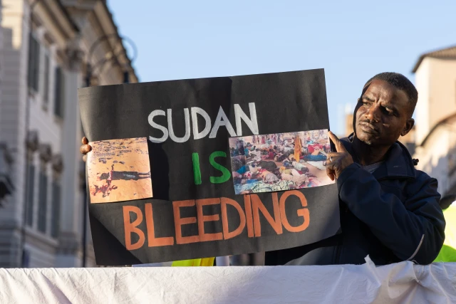 A protest in Rome’s Piazza Santi Apostoli calling for an end to the genocide in Sudan and urging the world to break its silence. (Photo: Reuters)