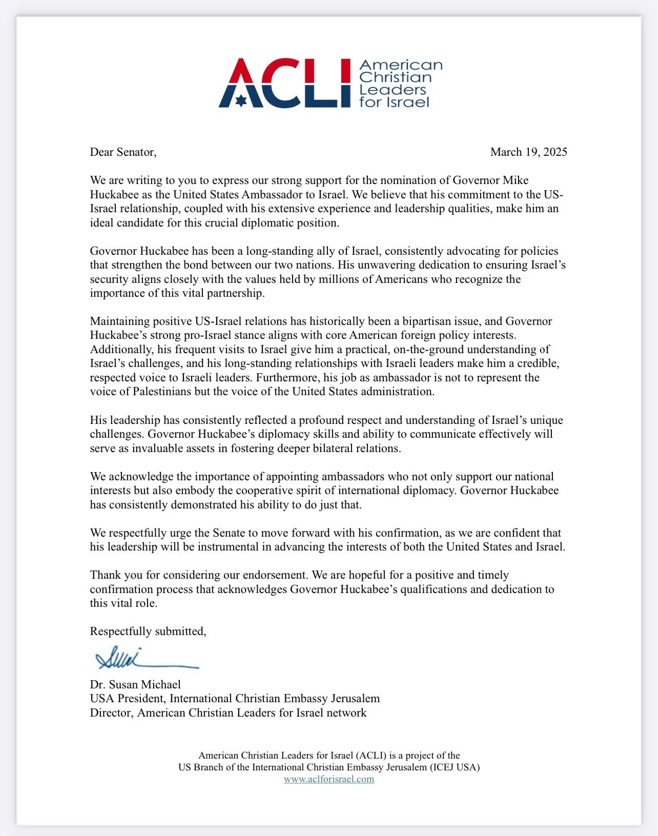 AMERICAN CHRISTIAN LEADERS FOR ISRAEL SEND PRO-HUCKABEE LETTER TO THE SENATE