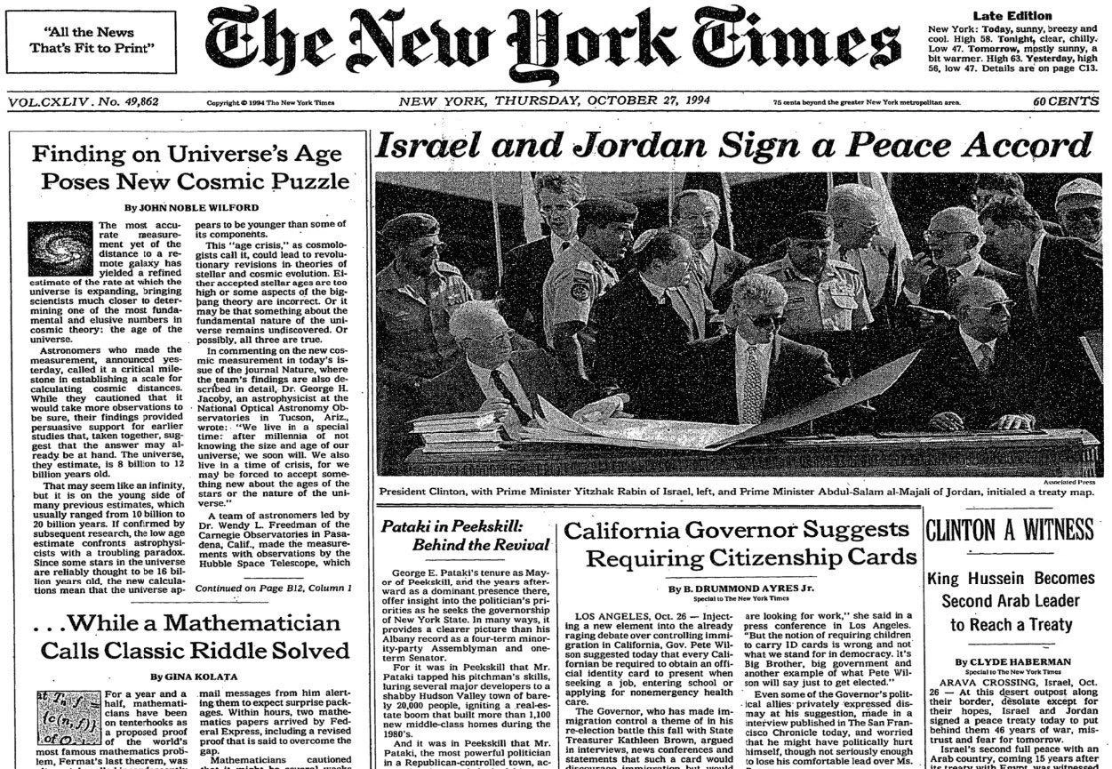 55. On October 26, 1994, Israel signed an historic peace treaty with the Hashemite Kingdom of Jordan.