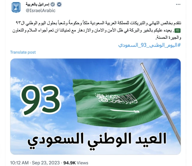 The Saudi National Day greeting comes just days after Israeli Prime Minister Benjamin Netanyahu, said in his UN General Assembly address: “We are at the cusp of an historic peace between Israel and Saudi Arabia.”