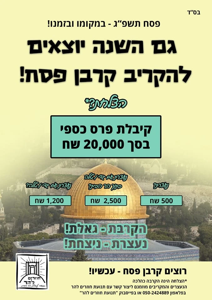 During the most recent Passover last April, the organization offered monetary rewards of different levels, depending on how close one came to sacrificing a lamb or goat on the Temple Mount.