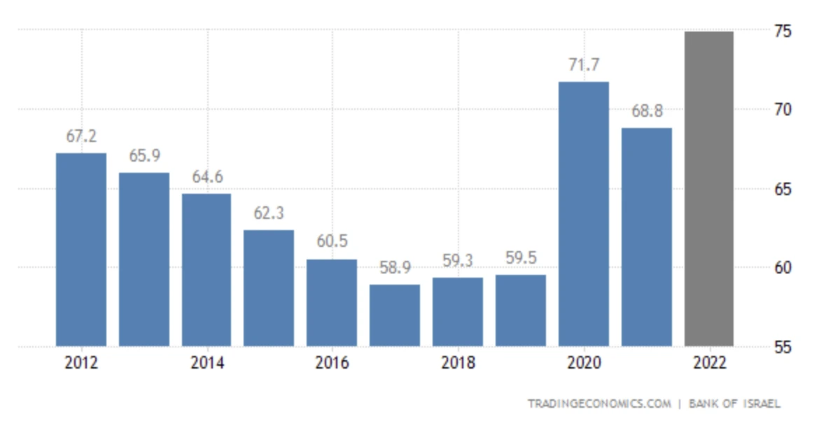 According to sources with knowledge of the situation, Israel's debt-to-GDP ratio is expected to exceed projections for 2022 and fall from highs of 68% last year to pre-pandemic levels of 60–61%.