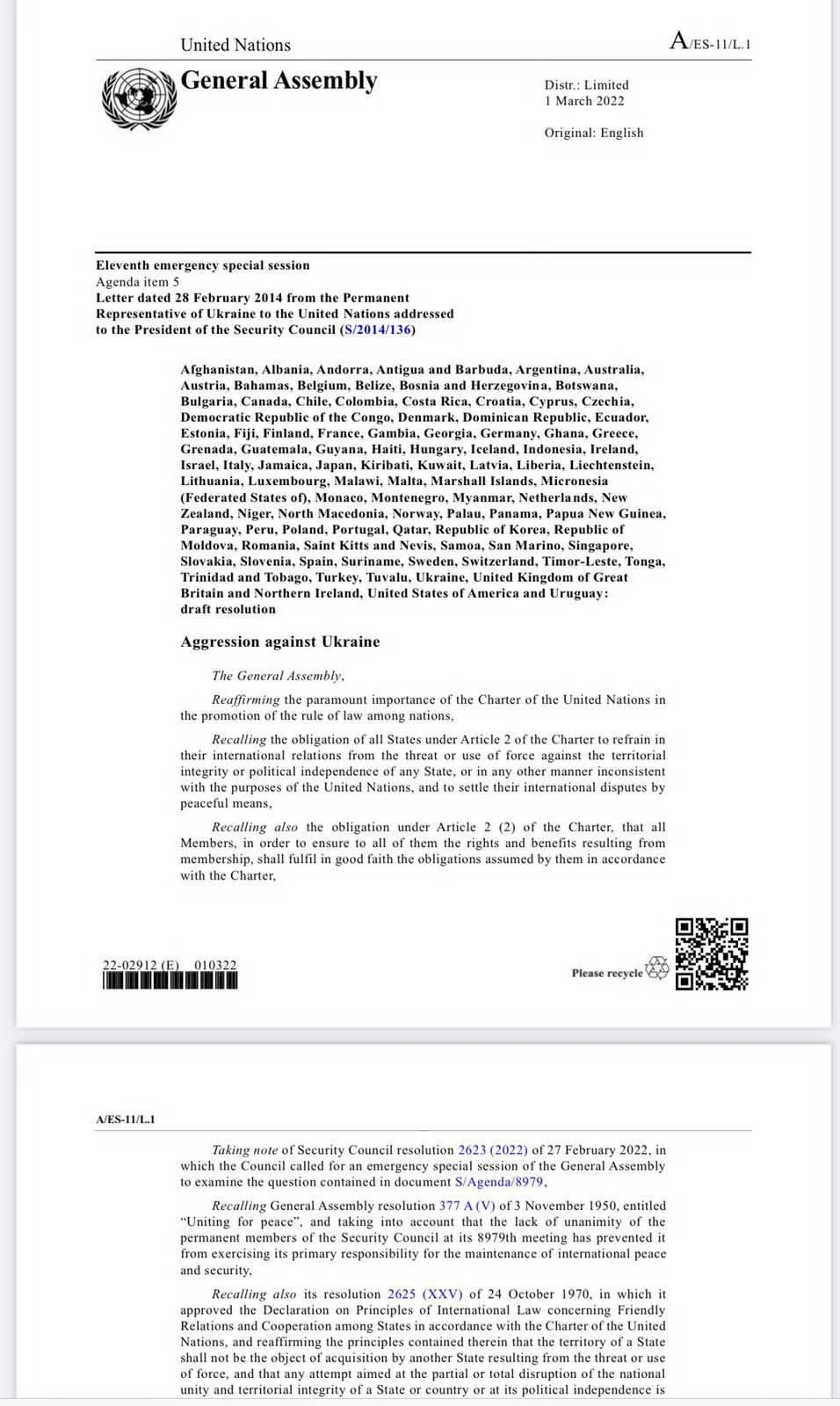 Syria opposed the resolution, Iran abstained; Prime Minister Bennett held back-to-back calls with Putin and Zelenskyy, as Israel sends humanitarian aid to Ukraine, but not weapons